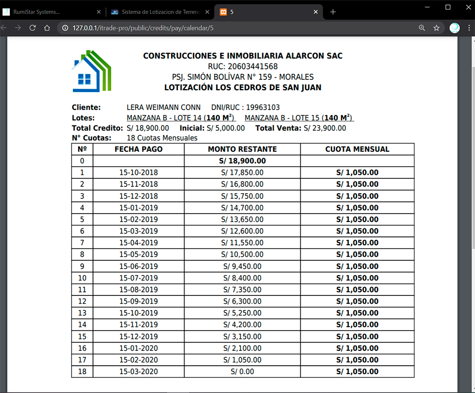 El módulo de ventas genera contratos de compra-venta y cronogramas de pagos de manera eficiente: